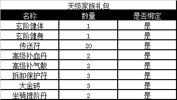 3、家族排行榜第一位即每位家族成员得到“天级家族礼包”*1;家族排行榜二至五位即每位家族成员得到“地级家族礼包”*1;家族排行榜六至十位即每位家族成员得到“玄级家族礼包”*1;