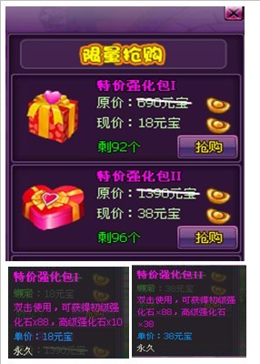 活动期间仅三天,伙伴、锻造、异火界面增加超值限量礼包【特价物攻包,特价斗攻包,特价闪避包,特价体悟包,特价洗灵包,超级技能包,特价强化包,特价打孔包,特价镶嵌包】,活动期间每天限量出售,不要错过机会喔!