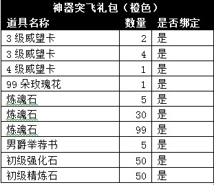 描述:“神器突飞礼包”包含打造神器的各种珍惜材料道具、以及大量威望