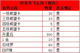 描述:“时装突飞礼包”包含升级时装的各种材料道具、以及大量威望