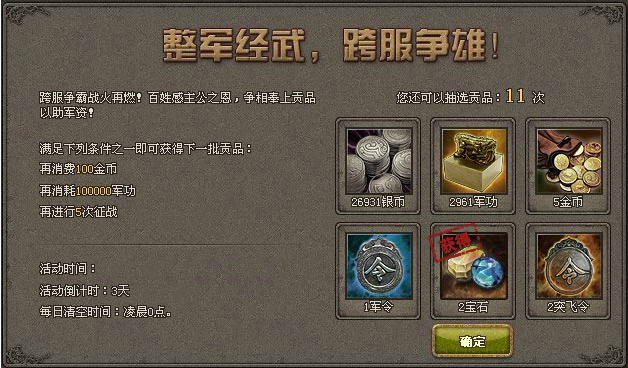 每获得一批贡品,您都能在六件中抽选其一,不仅有可能得到银币、金币、军令、军功、威望、突飞令中的一种,还有机会获得额外2倍、4倍、10倍暴击奖励 。
