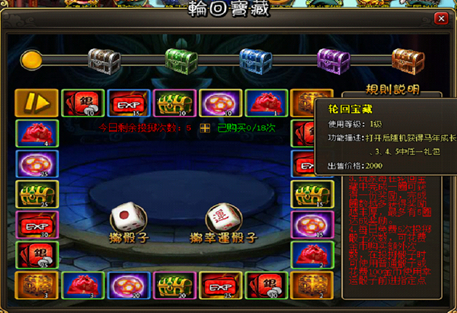 2.玩家投掷骰子可在轮回宝藏中前进相应点数格子数并获得相应格子中的奖励
