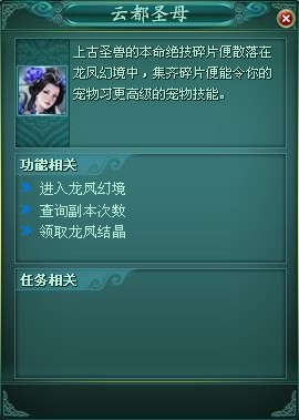 在陪游仙侠风云中,"无量云都"已开放龙凤幻境副本,每次进入龙凤环境副本需要"龙凤结晶"1个,60级以上的角色每天可以在"无量云都-云都圣母"处免费领取一个"龙凤结晶",每个角色每日最多可以进入三次龙凤幻境副本。龙凤结晶也可以在商城买到,挑战"龙凤幻境"可以获得大家梦寐以求的宠物高级技能碎片以及宠物内丹精华。此任务只能单人完成,不可组队进入。