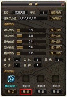 点击翅膀升级按钮即可完成翅膀升级操作,翅膀每次升级将恒定消耗800万灵力值。
