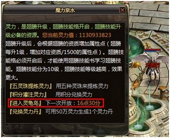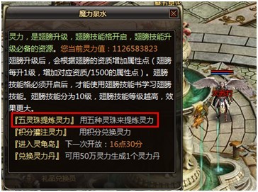 与魔力泉水NPC对话,投入五灵珠即可获得随机灵力值奖励,并且有一定几率获得翅膀技能书与信仰神水。投入的五灵珠的种类越多获得的灵力值越高,同时获得技能书与信仰神水的几率也越高。