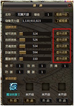 点击翅膀升级按钮即可完成翅膀升级操作,翅膀每次升级将恒定消耗800万灵力值。