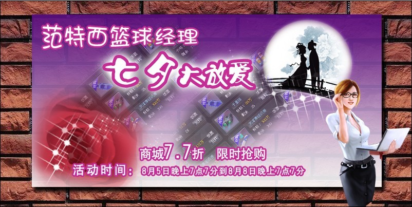 为表诚意,《范特西篮球经理》特在今年七夕,为你奉上七夕7.7折商城打折特惠活动。在七夕活动期间,《范特西篮球经理》将对所有的商城道具给予一定的消费折扣——系统将自动减免提升工资帽的一定费用,而商城中的道具亦将打折出售。