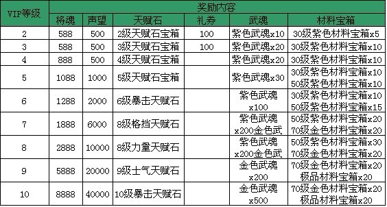 【活动内容】:充值金额满100金币即可成为VIP1级,VIP1级可领取高达300%的礼包奖励返还!礼包内容:军令x10、将魂x188、银币x20万、蓝色武魂x20、礼券x100
