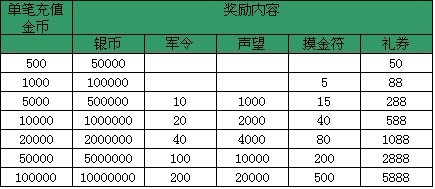 【活动内容】:活动时间内,单笔充值订单充值金额满足以下条件即可获得相应礼包一份,多次充值可以多次领取奖励!