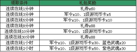 【活动内容】:活动期间,玩家单次连续在线满相应条件即可领取相应的礼包奖励