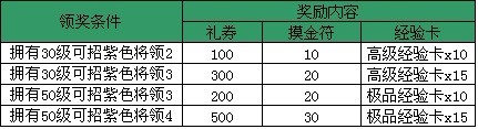 【活动内容】:活动时间内招募紫色武将满足以下条件即可获得相应的礼包奖励!