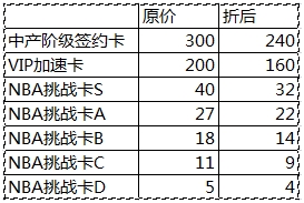 活动内容:指定时间段内商城道具“中产阶级签约卡,VIP加速卡,全系列NBA挑战卡”打折出售