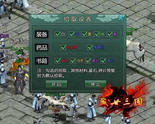一键轻松就搞定!在陪游《盛世三国》,无论是装备、书籍还是药品,玩家们只要设置了拾取设置就可以轻松玩转陪游《盛世三国》。为什么这么说?这么说的原因就是,你在战场上和敌人战斗,当你解决掉一个敌人的时候地上就会出现一些宝贝,而这些宝贝你肯定来不及捡起来。万一在你捡宝贝的时候强敌出现了,你就不得不偿失了。为此,只要你设置了拾取设置你打到那里,只要是宝贝系统就会自动的帮你拾取。怎么样?很方便吧!如果你也觉得方便就赶快去设置吧!